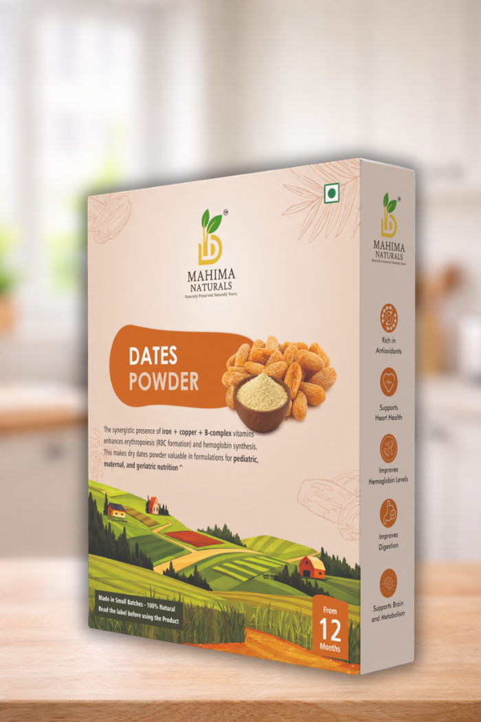 Dates powder is a natural sweetener and nutrient-rich food made from carefully dried and finely ground dates, preserving their inherent vitamins, minerals, and bioactive compounds. It is an excellent source of natural carbohydrates that provide instant and sustained energy, making it especially beneficial for children, athletes, and individuals with high energy requirements. Unlike refined sugar, dates powder delivers sweetness along with essential nutrients, making it a healthier alternative for daily use.